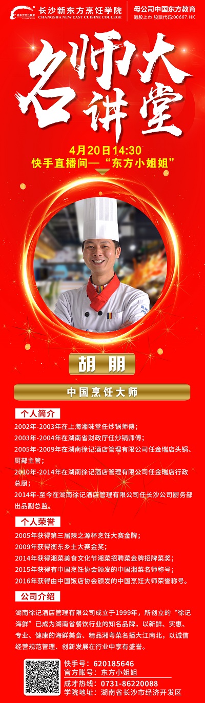 本次名師大講堂,胡朋大師除了帶大家了解將來的就業(yè)企業(yè)徐記海鮮外,還將帶來幾道湘菜的現(xiàn)場制作,同時(shí)還會(huì)談?wù)勛约旱膹膹N經(jīng)歷以及對(duì)未來餐飲行業(yè)發(fā)展前景的見解。屆時(shí)同學(xué)們不僅能觀看大師做菜,跟大師學(xué)習(xí)菜肴制作,還能暢所欲言,就學(xué)廚過程中遇到的種種問題現(xiàn)場向大師請(qǐng)教,真正做到學(xué)以致用。