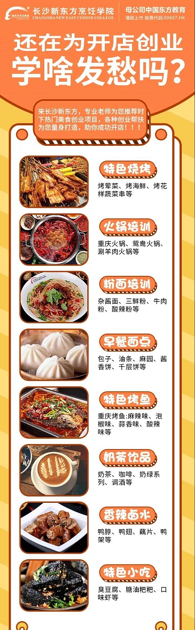 美食品種上千上萬余種多,無論是中餐、西餐還是西點(diǎn),甚至是火鍋冒菜、小吃甜品,主要跟吃有關(guān)的,都是創(chuàng)業(yè)的好項(xiàng)目。長(zhǎng)沙新東方烹飪學(xué)校,在為學(xué)子提供專業(yè)的技術(shù)技能培訓(xùn)的同時(shí),更會(huì)全程幫扶學(xué)子創(chuàng)業(yè),助力學(xué)子成功成才!